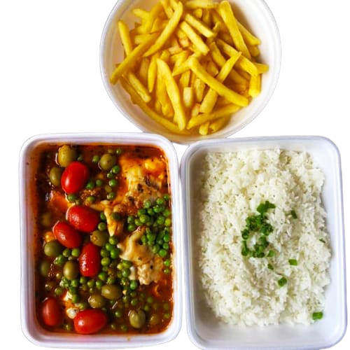 Tilápia empanada, Mussarela, Molho vermelho Ervilhas frescas , Azeitona , Tomatinho cereja, Arroz branco, Fritas